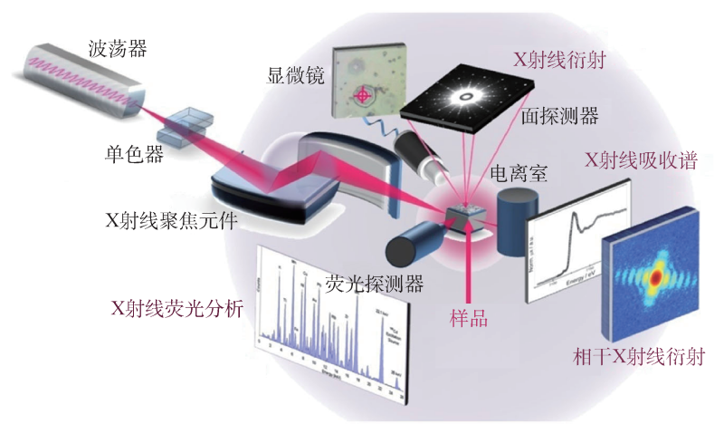 同步辐射是一种由接近光速运动的带电粒子在弯曲的轨道上运动时产生的电磁辐射现象[1—3]。在同步辐射光源装置中,电子通过加速器加速产生了高能量的电子束并在磁场中偏转,由于相对论效应,这些电子会发射出从红外线到X射线的各种波长的光子。类似于阳光照射到物体之后,很多光子携带着物体的颜色、大小和形状等信息进入我们的眼睛一样,在同步辐射光源中,人们利用各种探测器代替了眼睛,使用波长覆盖从原子水平到生物细胞尺度的大范围的同步辐射光子,研究各种环境中的物质。这为物理、化学、材料科学、计量学、地球科学、环境科学、生命科学等各个领域的前沿研究突破和关键技术的实现提供了有力支持。