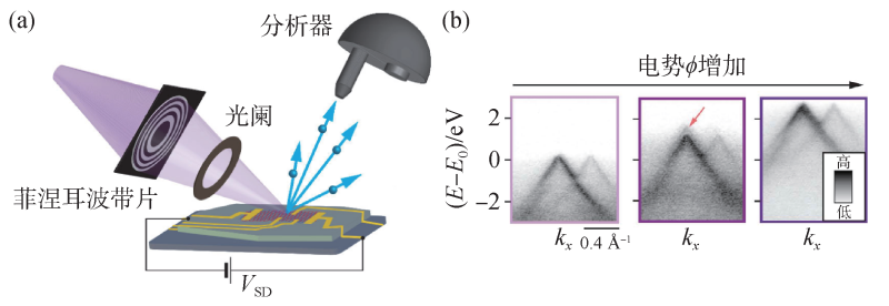 图2 (a)利用nano-ARPES测量双层石墨烯异质结器件的示意图,光子经过菲涅耳波带片被聚焦到样品上,然后从样品上出射的光电子被探测器收集;(b)当电流通过时,不同位置的能带测量结果[21]