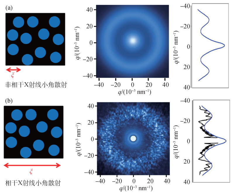 图3 X射线小角散射(SAXS)实验   (a)非相干X射线照射下无序纳米球体系的二维和一维散射图案;(b)相干X射线照射下产生的二维和一维散射图案[8]。其中,左侧是无序纳米球体系的示意图,中间是二维散射图案,右侧是一维图案