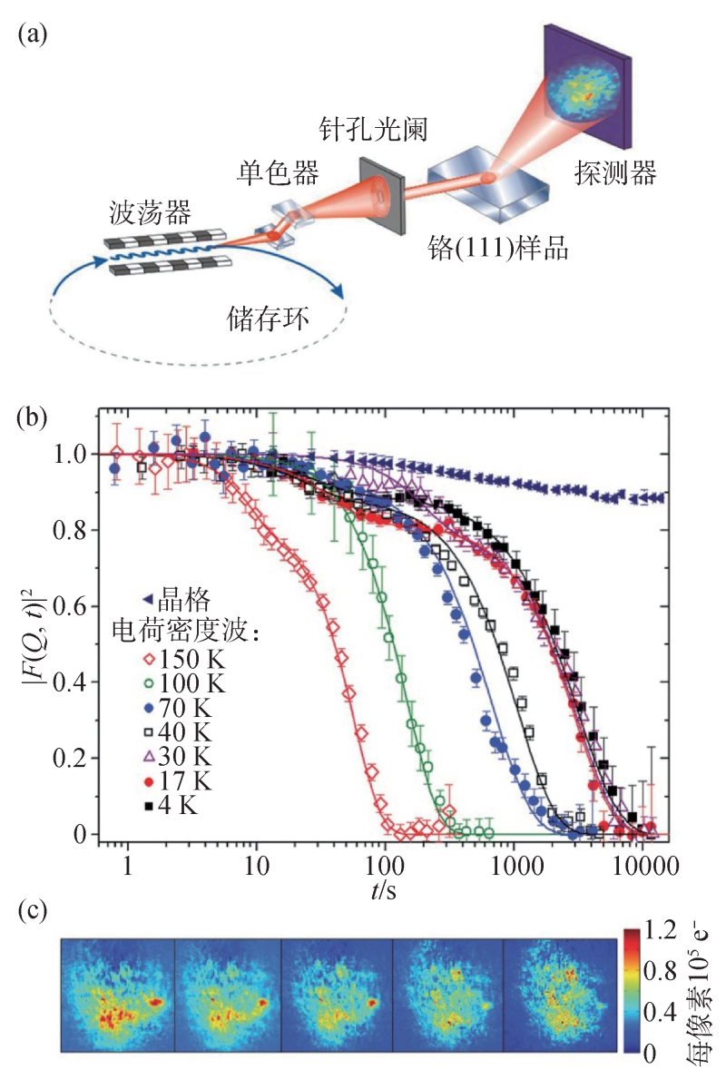 在第三代光源上,由于X射线的相干性较低,散斑图案会被抑制,因而散射信号形成的强度变化呈现平滑的弥散分布。然而,利用第四代光源所提供的具有空间相干性的X射线,散斑图案将得到保留,其强度分布可以反映样品的精确结构[23]。如果样品不是静态的,而是存在动态变化,那么散射图案也将发生相应的演化。基于相干X射线散射的X射线光子相关光谱学(X-ray photon correlation spectroscopy,XPCS)可以利用归一化强度相关函数来分析一系列散斑图案随时间或外部变量(如磁场、电场或温度)的变化,从而提供有关样品微观动态行为的信息[24]。由于相干衍射所产生的对比度可以来自化学、磁性和结构的特征,因此XPCS能够揭示多种复杂现象的时间依赖性,包括复杂自组装、畴壁运动,以及磁性与电子态的涨落等[25—28]。图4展示利用XPCS技术在铬(Cr)中探测电荷/自旋密度波的量子涨落。散斑图案与磁畴构型密切相关,随着时间流逝,散斑的关联性逐渐衰减,这意味着磁畴构型发生了变化。在较低温度下可以看到,散斑关联性的时间依赖性不再随温度的变化而变化,这说明高温时磁畴壁的运动受到热效应的影响,而在较低温度下量子涨落的作用更显著。
