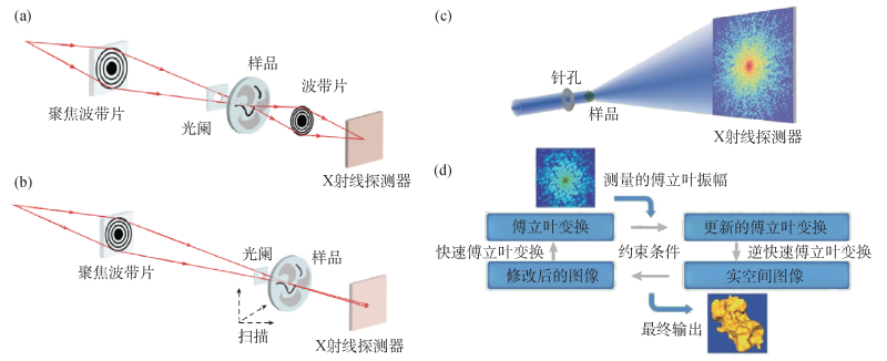 图5 (a)全场透射X射线显微镜示意图;(b)扫描透射X射线显微镜示意图;(c)相干衍射成像示意图;(d)相位恢复算法在实空间和倒空间之间进行迭代[14,31]
