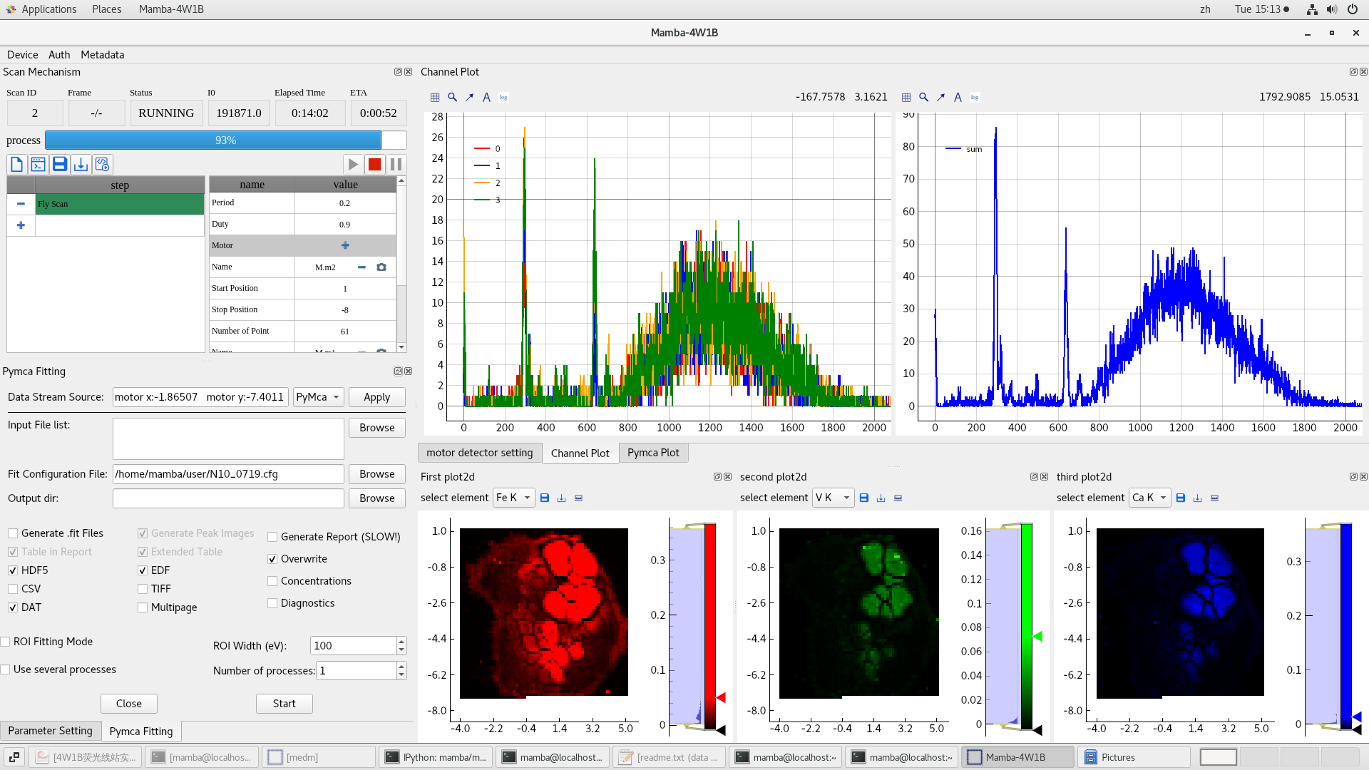 图1: Mamba-XRF Mapping成像软件(4W1B)数据采集界面,实时2D Mapping和1D Spectra显示