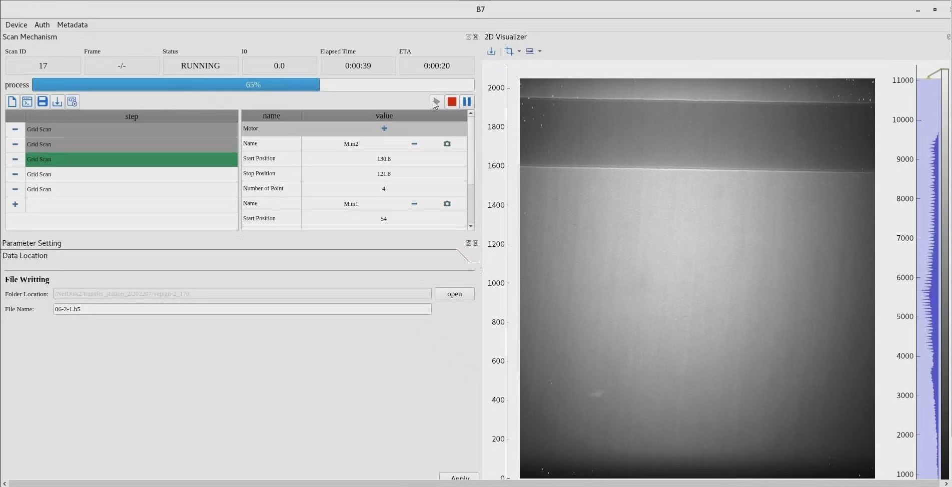 在BSRF装置2022年首轮专用光机时中,基于Mamba软件框架开发的多类型实验控制与数据采集软件在相应线站进行部署,并开放用户使用,多位用户对软件的整体功能性、用户体验给予较高的评价并提出了许多建设性意见。其中,荧光扫描(XRF Mapping)成像实验控制与数据采集软件在4W1B线站正式部署应用,多个所外课题组基于该软件完成了实验数据的采集,用户可在点采、步进扫描、飞扫等多种实验模式中任意切换,并且通过集成在线数据处理软件进行一键式数据采集及分析;扫描显微成像(STXM)实验控制与数据采集软件在3W1线站实现部署应用,用户可基于该软件进行多组发动机叶片的批量扫描,极大地加速了实验数据采集的效率与自动化水平;由HEPS硬X射线成像线站(B7)自主研制的大型面探测器(6K*6K像素)也实现了在Mamba内的集成与应用;拉曼散射实验分析晶体自动调姿离线测试完成验证后,基于Mamba研制的三晶体自动优化,在1W2B线站进一步得到在线实测验证:成功实现光斑自动识别、光斑与晶体匹配、自动调焦等功能,提高调光效率。同期,光束线软件系统召集Mamba开发进展研讨会,向HEPS光束线部各系统工作人员报告并讨论了Mamba软件框架的研制进展与下一步开发计划。