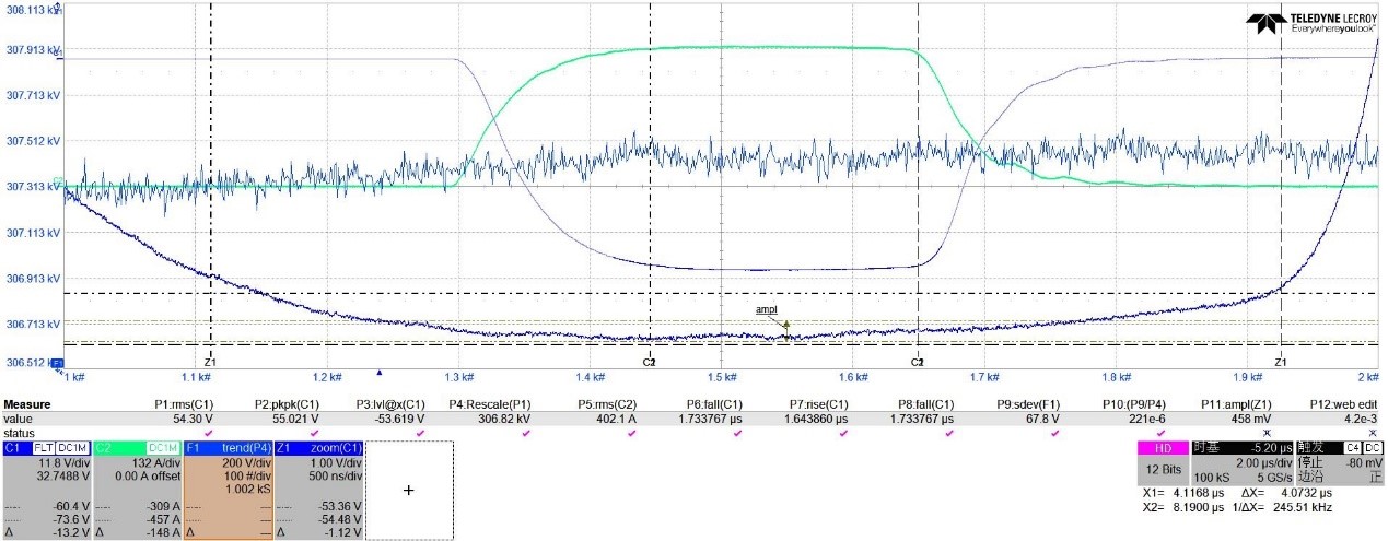 大功率固态调制器为HEPS直线加速器功率源系统自行研制,设计指标包括脉冲高压、脉冲电流、脉冲顶部宽度、重复频率、脉冲顶部宽度(峰峰值)、脉冲重复稳定度(3000脉冲,有效值偏差),分别为315kV、380A、4μs、50Hz、优于±1%、0.1%。在HEPS直线加速器现场的速调管实际负载下测试结果为:313.26kV、361.84A、4μs、50Hz、±0.97%、0.02%。
