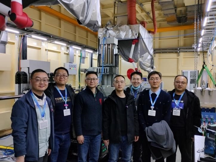 图4. 测试团队在上海光源稀有元素线站7元1m-XES谱仪前合影,(从左到右) 郭志英、徐伟、曾建荣、杨俊亮、张玉骏、刁千顺、靳硕学;