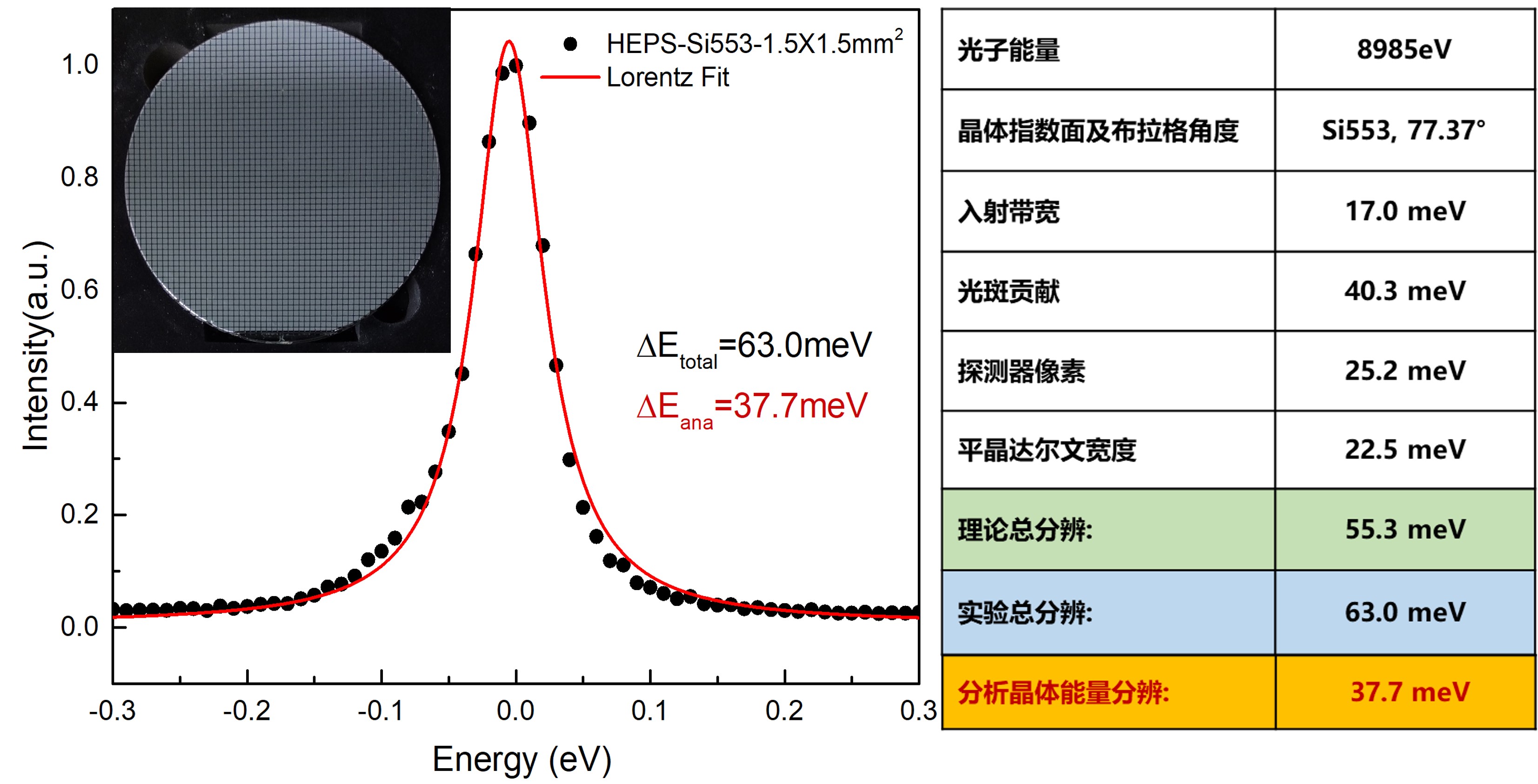图3.  Cu K-edge-RIXS实验用,曲率半径2米的像素型分析晶体及其实验结果