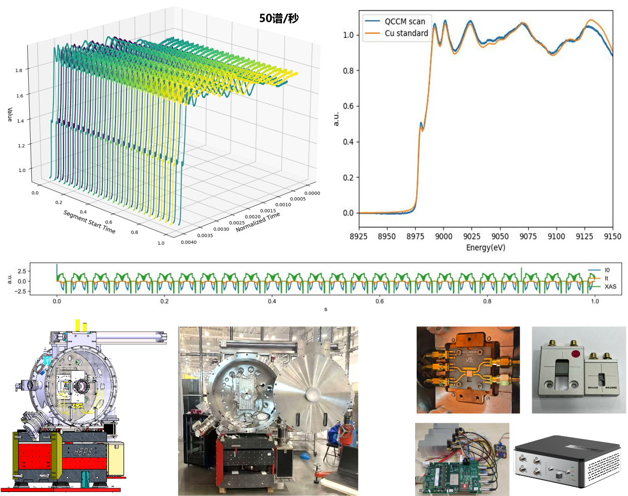 Cu箔XANES随时间的谱图展示及其与常规步进采集数据的对比。X射线吸收谱学线站:HEPS团队通过全套自研设备(快扫单色器及运动控制、金刚石探测器及采集电子学),实现了单谱20ms(50谱/秒)的XANES时间分辨能力