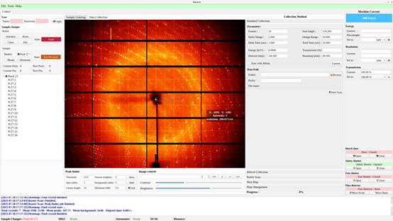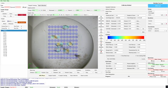 本线站研究人员基于PyQt,开发了本线站专用的晶体衍射线站控制与数据采集系统,实现衍射仪MD2S的完全控制。实现与EPICS的接口,实时显示光束线状态,控制衍射仪平台与探测器平台的运动。整合机械手控制,实现样品的自动加载。并开发微晶体的Raster和helical数据采集功能。并实现了网格扫描的自动热图生成和定位等高级功能。另外本系统也可以和HEPS通用软件系统(Mamba)实现顺利通信和数据交流。