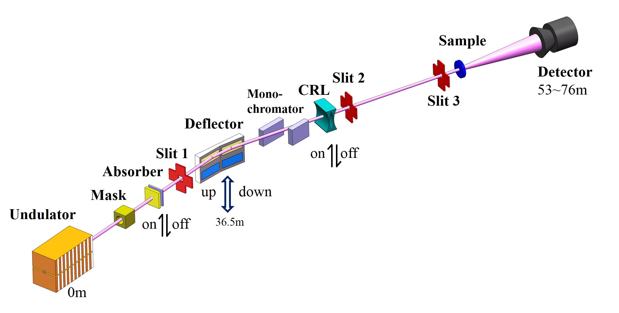 为能满足广大用户的常规的测试需求,粉光小角散射系统追求建设一个结构简单、稳定性高、通量高、统计性好、多功能SAXS线站。系统整体设计概述:由真空外波荡器产生细束基波辐射(8-12keV),能量带宽1.5%,(这种准单色光称为粉光),它被水平偏转和准直后照射到样品上,散射信号被安置于光路内的SAXS、WAXS和USAXS探测器分别接收,获得不同角度范围的散射信号。
