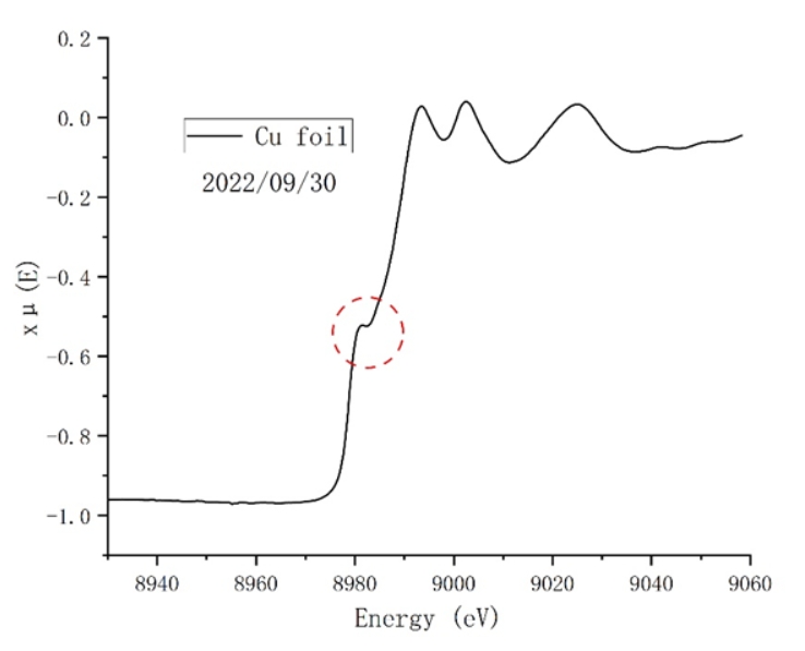 图4 1W1B实测铜K边吸收谱。吸收边上“小突起”清晰可见,由此可半定量表明1W1B束线能量分辨率达到了设计值: <1-3x10-4(9KeV处)