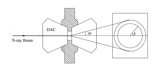 在前面两种实验方法中,金刚石对顶砧的压力轴与X射线衍射面的法线垂直;在径向衍射实验方法中,压力轴与X射线衍射面的法线成一定夹角。入射光可以是白光或者单色光,下面的图6、图7中展示了入射光为单色光时,常规X射线衍射与径向衍射实验方法的工作原理。径向衍射实验方法可以用于探测物质在高压下强度、弹性、织构等信息。