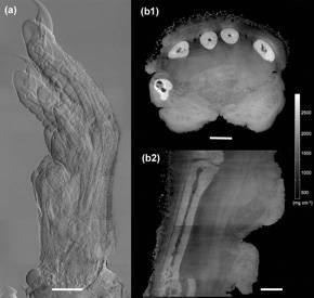 附图.低剂量、快速X射线相位CT实验结果,样品为大鼠爪,(a)微分相位衬度投影像,(b1)轴位断层重建像,(b2) 冠位断层重建像。图像中不但可以看到骨头,而且可以看到肌肉甚至毛发。