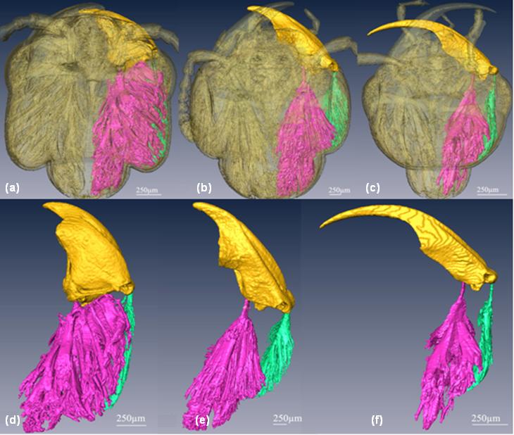 以大颊隐翅虫(Noddia sp.)、大隐翅虫(Creophilus maxillosus)和歧隐翅虫(Hesperosoma sp.)为代表类群,通过北京同步辐射装置的微米级X-光断层扫描技术采集其头壳、上颚及上颚肌肉数据并重构得到三维结构图,分析发现三个物种中起源于头后侧角即后颊后缘的肌纤维具有较大的变化。在大颊隐翅虫中起源于头后侧角的肌纤维主要为短肌纤维,与肌腱形成大约30度的角度;在大隐翅虫中,起源于头后侧角的肌纤维主要为长肌纤维,与肌腱形成小于30度的角度;而在歧隐翅虫中,头后侧角没有上颚收肌肌纤维的着生。且发现随着上颚长度的减小宽度的增加和上颚顶端角度的减小,上颚收肌传递到上颚顶端的力逐渐增大,因此粗壮的和较尖的顶端产生较大的上颚抱握力量,从而需要更发达的上颚收肌来支持。