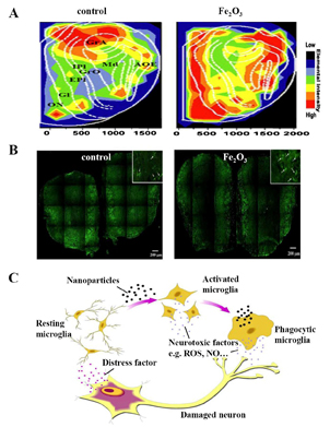 小胶质细胞作为中枢神经系统(CNS)的主要免疫细胞,具有类巨噬细胞功能,在介导CNS的先天性免疫中发挥关键性作用。明确小胶质细胞与纳米材料之间的相互作用,对探讨纳米材料的神经生物效应具有重要意义。我们通过研究鼻腔暴露纳米氧化铁经嗅神经转运后对脑组织的病理损伤作用和小胶质细胞的活化状态,发现鼻腔滴注纳米氧化铁,可导致嗅球、海马、纹状体组织发生病理损伤,并诱导各组织内的小胶质细胞发生增生活化,其中嗅球组织变化最明显。体外细胞实验亦发现,纳米Fe2O3可诱导BV2小鼠小胶质细胞增生活化,活化小胶质细胞吞噬纳米颗粒并释放ROS和NO,但并未观察到细胞因子IL-1β、IL-6和TNF-α水平升高。说明当纳米材料进入脑组织时,小胶质细胞的活化在机体警示和抵御纳米材料入侵过程中发挥了重要的作用。