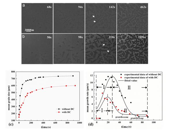 利用北京同步辐射装置(BSRF)4W1A-X射线成像实验站获得的6.7μm分辨率的不同条件下Sn-Pb合金形貌演变成像图片及定量分析曲线:(a)不施加直流电条件下,枝晶的生长形貌;枝晶在某方向生长旺盛,而在其余的方向生长均受到抑制,最终使得枝晶发生了“自我中毒”,呈现出一个不规则的等轴形貌。(b)施加直流电条件下,枝晶的生长形貌;由于电磁流对枝晶侧枝和底部的冲刷,减少的溶质的富集,使各个方向上的枝晶臂均衡生长,电流的作用解除了“自我中毒”,枝晶生长成了形貌规则的等轴晶。(c)不施加直流电和施加直流电条件下,平均晶粒尺寸随时间的变化曲线。(d) 不施加直流电和施加直流电条件下,平均生长速率随时间的变化曲线。