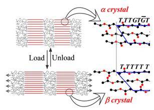 图示:聚丁二酸丁二醇酯的形变机理,拉伸方向为水平方向。α晶中分子链构象是T8GTG,而 β晶中分子链构象是T10。