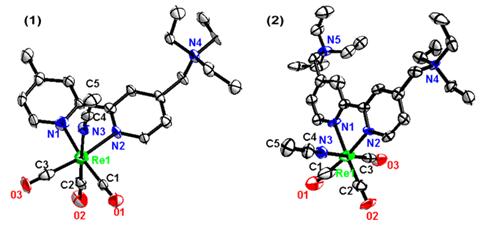 利用北京同步辐射装置(BSRF)3W1A-生物大分子实验站获得的0.800 Å分辨率的铼配合物[Re(CO)3(L1)(AN)](PF6)2和[Re(CO)3(L2)(AN)](PF6)3的晶体结构。两个配合物都是由一个Re原子、一个联吡啶的季铵盐配体、一个乙腈分子和三个羰基组成,其中三个羰基以特定的角度连接中心离子Re(I),形成了接近于八面体的形状。配合物[Re(CO)3(L1)(AN)](PF6)2和[Re(CO)3(L2)(AN)](PF6)3中Re(I)-C的键长与文献报道的其他类似的二亚胺类Re(I)配合物的相关数据相一致。在配合物[Re(CO)3(L1)(AN)](PF6)2和[Re(CO)3(L2)(AN)](PF6)3中以Re(I)原子为中心形成的N(2)-Re(1)-N(1)的夹角分别为74.85°和75.0°均小于90°,这样的角度有利于联吡啶配体和Re(I)形成近八面体的结构。