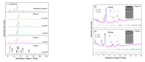 为了获得相变更多直接的信息,我们进行了角散射XRD实验。图4显示了最高加压到11.2 GPa时一些典型的衍射谱。1.0 GPa时的衍射谱明显和常压下的衍射谱不同,标志着从相1变为相2。如图5,完全卸压后衍射图可指认晶体的空间群为Pnma。在1.8 GPa出现一些新的衍射图,表明发生了另一个相变。我们认为相3的空间群为Pna21。完全卸压后,最后的相为相2,表明相1是不可逆的,而相2是可逆的。