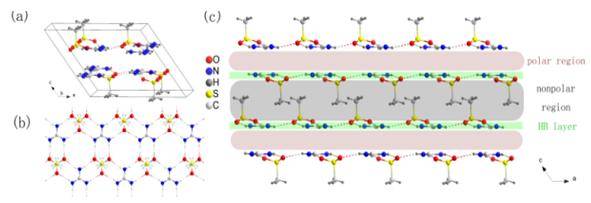 基于胍阳离子(C(NH2)3+)和磺酸根阴离子(RSO3-)结合而成的超分子结构在超分子化学中占据重要的位置。层状胍盐已经通过单磺酸盐和二磺酸盐离子合成得到。氢键层的完整性归因于由磺酸盐中氧原子的6个孤对电子和胍盐中的6个质子而形成的氢键的最大化,和正负离子之间的静电作用。近来,磺酸胍和其他一些基于胍离子的结构中的铁电相被观测到。尽管提到了以上这些,但是对磺酸胍机制特性的研究几乎没有。由于甲基磺酸胍(GMS)结构简单,因此我们把它作为一种理想的例子来探究磺酸盐高压下的结构变化。我们运用原位拉曼光谱和北京同步辐射装置4W2-高压实验站的XRD实验技术研究了GMS在高压下的变化,压力上限为11 GPa。在常压下,GMS显示出典型的二维氢键双层图案超分子结构(图1)。