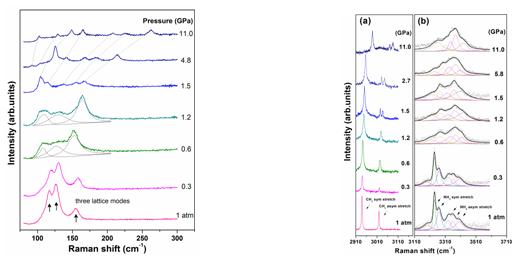 图3显示了2910-3120 cm-1和3110-3600 cm-1内典型的拉曼谱。0.6 GPa,有一个明显的NH振动位置和强度的变化,这表明结构中的氢键网络发生了改变。因此,第一次相变可能和氢键重排有关。第一次相变可能是二维氢键网络的坍塌,第二次相可能是一个三维氢键超分子结构。1.5 GPa,CH3反对称伸缩振动模峰位出现劈裂,然而NH的伸缩模无明显变化。1.5 GPa以上的NH拉曼图和II相时是一样的,这表明第二次相变不是由于氢键网络的重排,而是由于甲基组的变形,和CS伸缩模和CH3摇摆模的演变一致.