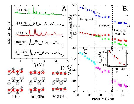 纽约州立大学石溪分校的M. C. Aronson研究小组、中国科学院物理研究所超导实验室等与北京同步辐射光源(BSRF)4W2-高压实验站合作,对LaMnPO采用理论计算与各种实验测量相结合的方法得到了其新的物理图像,提出Mn基绝缘体是非常近邻电子退局域态的。其中,在高压实验站完成的对样品的原位高压X射线衍射结构分析实验结果表明,在16GPa左右LaMnPO晶体结构从四方向正交结构转变,在约30GPa时出现体积突然塌陷,塌陷率达10%。
