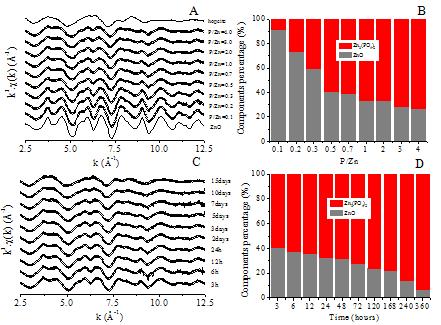 该研究表明低浓度的磷酸盐在短时间内即可显著降低溶液中自由Zn2+的浓度,而溶解Zn2+离子被认为是纳米ZnO的主要毒性来源,因此磷酸盐的存在会降低纳米ZnO的毒性效应。同时磷酸盐的存在显著改变了纳米ZnO的微观形貌,球状纳米颗粒逐渐发生表面腐蚀,产生团聚、融合,最后转变成无规则的具有微孔结构的颗粒。XAS、HRTEM和XRD分析表明纳米ZnO的形态也随时间和磷酸盐含量的增加由ZnO向磷酸锌转化,转化产物主要包含晶体态的正副磷锌矿,同时有无定形态的ZnO和磷酸锌生成。这些都将显著影响纳米ZnO的环境行为和生态效应。