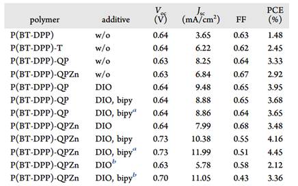 基于封端的聚合物制作的体异质结聚合物太阳能电池(BHJ PSCs)的转换效率(PCEs),相较于没有封端处理的聚合物有了明显的提升。尤其是基于用喹喔啉[2,3-b’]卟啉锌进行封端的材料P(BT-DPP)-QPZn制作的器件中,在使用了配位添加剂4,4’-联吡啶(Bipy)之后,器件的转换效率从2.92%提高到4.45%。此外,热退火老化实验表明,P(BT-DPP) QPZn-PC71BM器件在使用了Bipy添加剂后处理后,其共混膜在最佳形貌下的热稳定性有了明显的提高。经110oC下1h的热老化处理后,只用DIO作为添加剂处理过的光伏器件的转换效率为2.12%,为老化前器件转换效率的61%;而用Bipy处理过的器件在老化后的转换效率保持在3.36%,为老化前转换效率的76%。结果表明,使用Bipy可以有效地锁定光伏层的形貌,减少器件老化产生的降解。