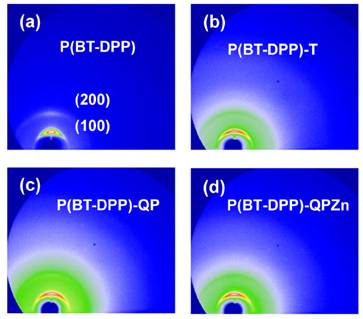 利用北京同步辐射装置(BSRF)1W1A-漫散射实验站,我们获得了聚合物的二维掠入射X射线衍射(2D-GIXRD)图像(图3)。未封端聚合物P(BT-DPP)的薄膜具有很强的(100)和较弱的(200)衍射峰,表示其聚合物分子具有强烈的结晶性;使用T、QP、QPZn封端的聚合物薄膜同样有明显的(100)和(200)衍射峰,但是其中出现的大弥散环表明封端基在一定程度上降低了聚合物的结晶性能。尽管如此,与其它的给体-受体型交替共聚物相比,这几个封端处理过的聚合物仍然具有相当强的结晶能力。