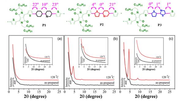 自 1986 年第一个以聚噻吩为活性层的场效应晶体管被报道以来,人们在有机共轭聚合物半导体材料和以其为活性层的薄膜有机场效应晶体管领域做出了大量的研究探索工作。尤其是近十年来,以 D-A 型有机共轭聚合物为半导体材料的薄膜场效应晶体取得了飞速的发展,并在柔性有源矩阵显示器、射频识别标签以及气体传感等领域得到了广泛的应用。有机共轭聚合物半导体材料作为有机场效应晶体管的核心部分,其结构与光电性能显得尤为重要。经过人们不懈的努力,已开发出了大量结构与性能优异的有机聚合物半导体材料。通过聚合物结构的合理设计,调节聚合物能级结构和分子构型,实现窄的能带隙和有序的分子堆积,是实现高电荷传输性能和空气稳定性有机薄膜场效应器件的有效途径之一。中国科学院化学研究所张德清课题组从聚合物的“结构-性能”相互关系出发,研究和讨论了聚合物结构(共轭主链结构的调控)对薄膜场效应器件电荷传输性能的影响。最近,他们以吡咯并吡咯二酮为受体,通过给体单元的结构微调,设计合成了三个新的共轭聚合物。理论计算与光谱实验结果表明,聚合物结构对其能级结构、分子构型和堆积方式有显著的影响,并最终影响到场效应器件的电荷传输性能。最后,他们通过薄膜形貌分析,证明了聚合物结构与器件性能之间存在的关系。该结果发表于2016年9月6日的Journal of Materials Chemistry C 上(2016, 4, 9359-9365)。