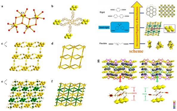 金属-有机框架化合物(Metal-organic frameworks, MOFs)因其独特的结构和广泛的应用(吸附、分离、分子识别和催化等)而广受关注。基于铀酰节点的MOFs化合物(UOFs)的结构设计与性质研究是一类锕系-金属有机框架材料,对于加深锕系配位化学研究、扩展锕系材料的潜在应用具有重要价值。与过渡金属及镧系金属的MOF相比,铀酰离子在水或非水溶剂中复杂的水解可能性使得自组装体系中铀酰和配体的配位行为更加难以预测和控制,但也赋予铀酰有机框架化合物(UOF)更多的配位模式和拓扑形态,有可能获得具有特殊结构基元或拓扑结构的新型铀酰-有机材料。中科院高能物理研究所石伟群课题组和四川大学化学院夏传琴课题组以有机碱作为模板,通过系统调控合成条件,成功获得了一类新型基于四核铀酰节点的铀酰-有机二重穿插网络材料,相关的研究成果发表在2016128日的《Chemical Communications》上。(Chem. Commun. 2016, 52, 1641-1644.