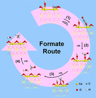 利用北京同步辐射装置(BSRF)获得了Ce3+的结构信息及其在催化反应中的结构变化。在催化剂还原过程中,Ce3+的含量逐渐升高,显示了Ce4+逐渐向Ce3+的转变过程。而在反应过程中,Ce3+的含量在通入反应气体后快速降低。结合原位红外的结果,证明Ce3+作为路易斯碱促进CO2转变为CO2d-,而自身转变为Ce4+。