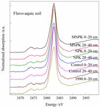 硫素同步辐射XANES分析是在北京同步辐射装置(BSRF)4B7A-中能实验站进行的。土壤样品(包括新鲜含水湿样)采用2.5 μm Mylar膜包裹,在氦气环境中直接测定XANES谱图。通过XANES分析考察不同施肥处理:空白对照、历史对照(1990年样品)、施用无机肥、施用有机无机肥等处理对土壤硫素形态分布与转化的影响特征,研究组认为长期施用有机肥可以促进还原态及中间价态有机硫在土壤中的累积,从而增加土壤有机硫及全硫含量。同时研究发现,化学分组提取方法会造成部分有机硫水解、转化成无机硫,从而导致土壤无机硫的组分分析结果偏高。研究结果对于从分子水平认识硫素在我国农田土壤赋存形态及其地球化学循环具有重要意义。