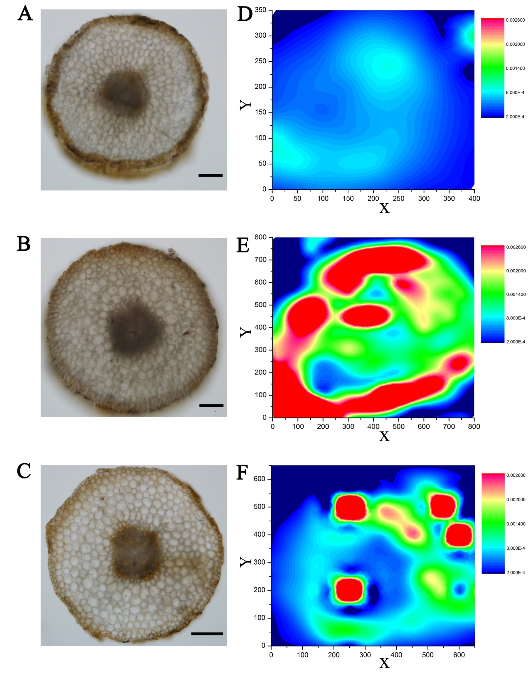 1 SR-mXRF结果显示观察到不同基因型材料根中铁元素的天然分布。