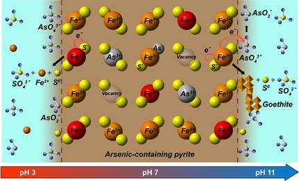 该研究组发现在含砷黄铁矿中,As以As(III)和As(?I)存在,分别取代黄铁矿晶格Fe(II)和S(?II)。As引入导致黄铁矿中高含量的以Fe(III)-S形式存在的Fe(III)。在含砷黄铁矿与As(V)的吸附与氧化还原过程中,单质S、SO42?和针铁矿为主要产物。由于含砷黄铁矿晶体结构的坍塌及As(?I)被氧化导致As(III)释放进入溶液。随着pH从3.0增加到11.0,存在不同的氧化还原机理。在pH 3.0–6.0,Fe(III)对含砷黄铁矿的氧化起主要作用,且新生成的As(V)和释放的As(III)被吸附在固相产物表面。在pH 7.0–11.0,溶液中As(V)为主要氧化剂,且氧化能力随着pH增加而增加。当pH从3.0增加到7.0和11.0时,掺入黄铁矿中的As释放比例从34.1%增加到45.0%和56.8%。