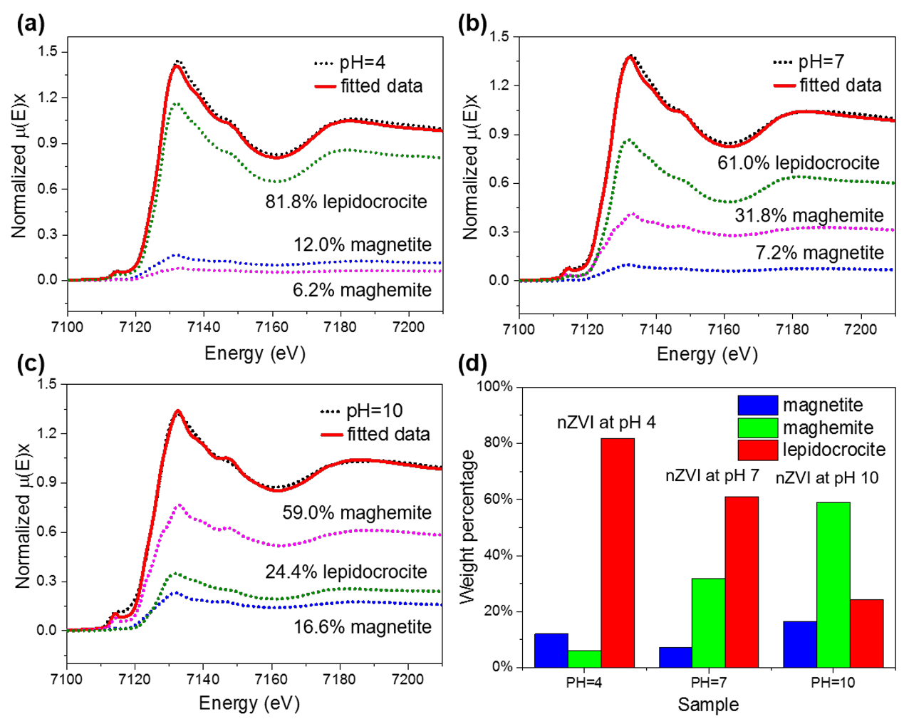 利用北京同步辐射装置(BSRFX射线吸收谱技术获得的吸附As(V)后的nZVI样品FeKXANES图谱以及LCF结果。在初始pH4时,nZVI的腐蚀产物主要为纤铁矿(γ-FeOOH),还含有少量的磁铁矿(Fe3O4)和磁赤铁矿(γ-Fe2O3)。而初始pH7时,腐蚀产物中γ-FeOOHFe3O4γ-Fe2O3的含量分别为61.0%7.2%31.8%。初始pH10时,腐蚀产物中γ–FeOOHFe3O4γ-Fe2O3的含量分别为24.4%16.6%59.0%。随着pH的增加,γ-FeOOH的含量显著下降,由81.8%下降到24.4%;而Fe3O4/γ-Fe2O3的含量则急剧上升,由18.2%上升到75.4%。而不同的铁(氢)氧化物对As(V)的吸附能力不同。