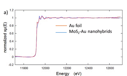 该研究组使用简便的溶剂热法合成了平均粒径小于3纳米的超小的二硫化钼与金纳米簇的复合物,该纳米复合物表现出了高效的氢析出反应催化活性:仅需66 mV的过电势,电流密度即可达10 mA cm-2,其催化活性远超二硫化钼或金纳米簇,且超过了大多数已报道的基于二硫化钼的电催化剂。作者经一系列表征证实在这一纳米复合物中存在从金到硫的电子转移以及金硫键,而这一电子耦合有助于提升导电性及二硫化钼上的载流子密度,从而提升了催化活性。在这一工作中,利用同步辐射光源得到的X射线精细结构谱为金硫键的存在提供了有力证据。
