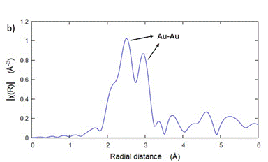 利用北京同步辐射装置(BSRF)获得的二硫化钼与金纳米簇复合物的X射线精细结构谱图。(a)二硫化钼与金纳米簇复合物以及金箔的金元素L3吸收边X射线近边结构谱;(b)金箔在R空间的傅里叶变换扩展X射线吸收精细结构;(c)硫化钼与金纳米簇复合物在R空间的傅里叶变换扩展X射线吸收精细结构