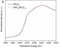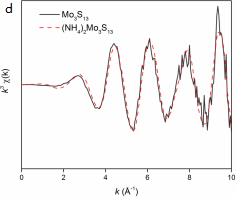 图1 线近边结构谱;(c)电沉积Mo3S13和(NH4)2Mo3S13的Mo元素K边的X射线扩展边吸收谱的傅里叶变换结果;(d)电沉积Mo3S13和(NH4)2Mo3S13的Mo元素K边的X 射线扩展边吸收谱拟合后的k空间曲线