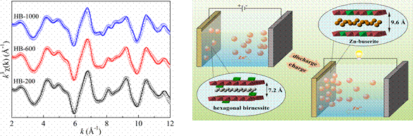 利用北京同步辐射装置(BSRFX射线吸收谱技术对吸附Zn2+后的电极进行表征。通过ZnK空间的EXAFS分析表明Zn主要吸附在水钠锰矿MnO6八面体层空位上下方、嵌入水钠锰矿层间、形成Zn-布塞尔矿及以ZnMn2O4存在于电极上。该工作被Environmental Science: Nano以扉页封面文章形式进行了报道。