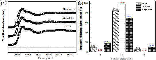 图1 25 ℃、pH 7、O2流速0.15 m3/h条件下,2 mM Mn(II)在水铁矿、针铁矿和磁铁矿体系中氧化终产物的Mn K边XANES实验数据和拟合数据(实线为在北京同步辐射装置1W1B-XAFS实验站获得的实验采集数据,圈圈为拟合数据) (a)及拟合所得的终产物中各价态Mn比例(b).