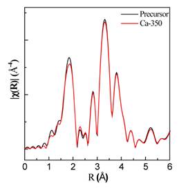 图 2. 在北京同步辐射装置(BSRF)1W2B-衍射谱学综合实验站测试获得获得傅里叶转变的Lu LIII边EXAFS谱图。数据表明局域规整反应后由于氧空位的产生,镥配位环境获得调整。Precursor和Ca-350分别代表前驱物和在350度处理的样品。