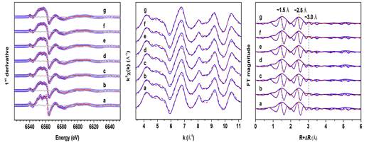 图1 (左) 在北京同步辐射装置获得的Mn K边XANES谱Combo分析;(中) Mn K边 EXAFS谱及其(右)傅里叶变换谱(蓝线是实验谱,红色实线或虚线是拟合谱)。a, HBir; b, AlHB4; c, AlHB5; d, AlHB7; e, FeHB5; f, FeHB13; g, FeHB21。