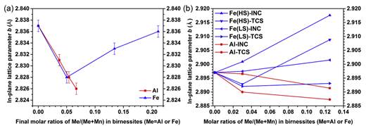图2 (a) 随水钠锰矿结构中Al3+或Fe3+含量变化,粉末XRD测定的a-b面内晶胞参数变化;(b)通过DFT计算,考虑Al-INC, Al-TCS, Fe(HS)-INC, Fe(HS)-TCS, Fe(LS)-INC和Fe(LS)-TCS等模型所得面内晶胞参数变化。