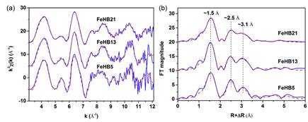 图3 (a) Fe K边EXAFS谱及其(b)傅里叶变换谱(蓝线是实验谱,红色虚线是拟合谱)。
