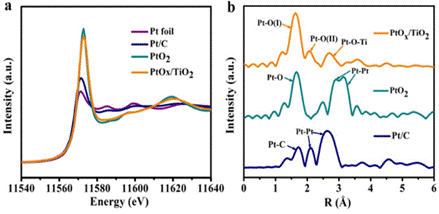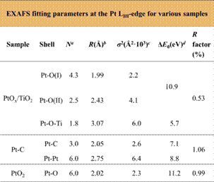 利用北京同步辐射装置(BSRFX射线吸收谱技术获得PtOx/TiO2催化剂中的Pt处于高度氧化的状态。通过拟合得到在PtOx/TiO2催化剂中Pt-O(I)的配位数为4.3Pt-O(II)的存在从而证实了PtOx原子簇与TiO2载体之间的强相互作用。为文章中DFT理论计算提供了一定的基础。