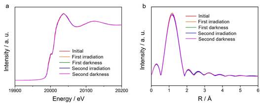 为了解析可溶性钼酸钠光催化剂材料中钼原子周边的本体原子级结构,该团队利用北京同步辐射装置1W1B线站X射线吸收精细结构谱学技术表征对该材料的钼元素的K边吸收边进行了采集,并结合X射线衍射结果,所制备的光催化剂材料具有与钼酸钠本体化合物相类似的几何结构。为进一步研究溶解部分钼酸钠材料的可能电子结构与本体原子级结构,该团队用原位X射线吸收精细结构谱学表征对上述未饱和钼酸钠溶液进行了测试,结果说明在光辐照以及在黑暗条件下的钼元素的局域本体原子级结构没有发生任何变化。原位X射线吸收精细结构谱学表征说明,钼酸钠溶液不会对紫外光辐照有所响应,说明材料活性部分就是未溶解部分的钼酸钠光催化分解水光催化剂材料。