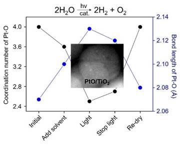 利用北京同步辐射装置(BSRF)X射线吸收谱技术直接观察到并定量解析了一氧化铂活性位点在光催化分解水过程中的结构变化。该团队发现,在光催化分解水过程中,一氧化铂助催化剂材料中的铂氧键长变为了2.13埃、配位数变为了2.5。这组数据和反应前后离线状态下的一氧化铂助催化剂材料中的数据有所差异,键长变化了2.9%、配位数变化了37.5%。这一结果首次实现固液相中催化剂材料活性位点在工作状态下的结构定量解析,同时也许会促使人们用截然不同的观点来考虑光催化分解水催化剂材料的结构与构效关系探索,并会促进一些与传统所不同的新颖的观点来制备更高效的光催化分解水催化剂材料。