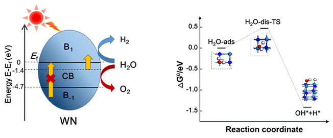 氮化钨材料的光催化反应可能路径图和其分解水反应过程中吉布斯自由能的变化曲线。理论上从B-1CB的最小带内跃迁跨度值是4.7eV,这意味着可用来光催化分解水的最长波长是264nm,与实际条件不符。幸运的是,从CBB1的带内跃迁跨度值满足氮化钨材料实现765nm光照射下全分解水的条件。另外,吉布斯自由能曲线变化趋势说明氮化钨光催化分解水过程为放热反应。