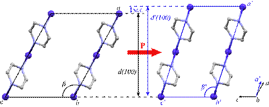 负线性压缩材料在持续增大的静水压作用下会沿晶体的某个特定的方向伸长。此类材料被认为在很多领域有重要的潜在应用,如超灵敏的压力传感装置,人造肌肉等。迫于负压缩材料种类的稀少,寻找新的负压缩机理已成为负压缩材料领域的研究重点课题之一。吉林大学超硬材料国家重点实验室邹勃教授课题组通过对硫氰酸钴吡嗪(Co(SCN)2(pyrazine)2)进行高压晶体衍射研究,发现了负压缩的一种新的机理——层滑移,相关的研究成果发表在了《The Journal of Physical Chemistry Letters》上。