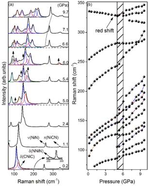 为研究Ni-Bz局部结构在高压下的变化,该课题组进行了高压拉曼研究。对于Ni-Bzν(NH3)模式的位置可以用来判定Ni-Bz的主客体体系是否发生了分解。在1.1 GPa5.0 GPa之间,新的ν(NH3)振动峰出现,并逐渐增强,而原有的振动模式则逐渐减弱至最后完全消失。这意味着,在此压力区间内,客体苯分子逐渐的脱离了主体框架,即发生了去组装过程。当客体分子完全脱离主体框架之后,主体失去客体的支撑,平面结构被破坏,发生5.06.0 GPa的相变。